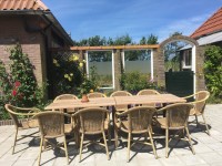 een eigen, volledig omheinde tuin en terras met tuinmeubilair, parasol en 2 tuinligbedden met matrassen.